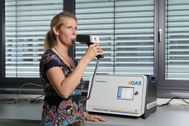 遠程取樣—呼吸采樣: 實際呼吸采樣只需一次呼氣。待測者呼氣進入采樣器,在后半部分,將5mL呼氣取樣到普通的注射器中。拉動注射器的活塞可以由待測者自己完成,或者由護士來幫助完成。如果采樣失敗,可以立即重復。